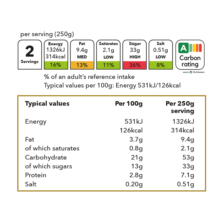 Tandoori marinade: Tomatoes, Water, Onion, Carrots, Potato, Sweet Potato, Peppers, Ginger, Leeks, Garlic, Coriander Leaves, Black Pepper, Cardamom, Fennel Seeds, Cloves, Dried Red Chillies, Caraway Seeds, Curry Leaves, Bay Leaf, Sugar Cane Juice, Fenugreek Leaves, Coriander Seeds, Tandoori Powder, Paprika, Coconut Cultures, Olive Oil.