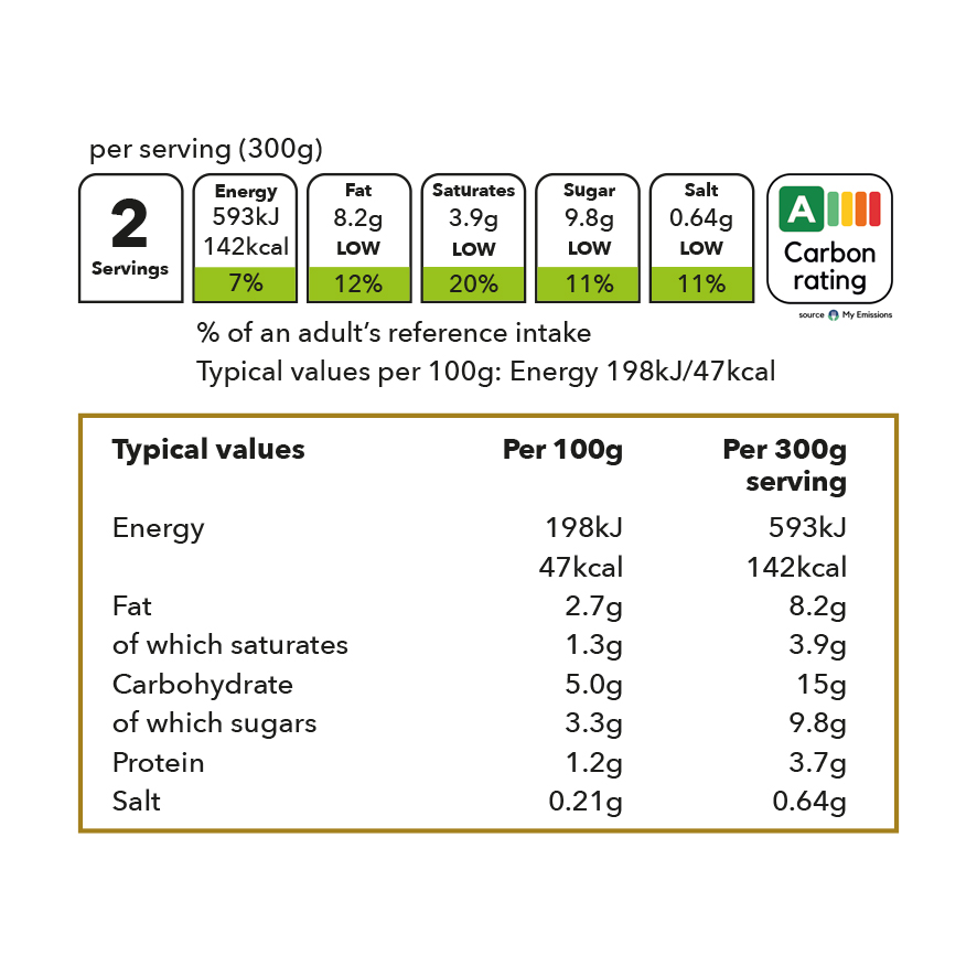 Tomatoes, Water, Onion, Carrots, Potato, Sweet Potato, Capsicum, Ginger, Leeks, Garlic, Coriander Leaves, Olive Oil, Fenugreek Leaves, Coriander Seeds, Tandoori Powder, Paprika, Black Pepper, Cardamom, Fennel Seeds, Cloves, Dried Red Chillies, Caraway Seeds, Curry Leaves, Bay Leaf, Cinnamon, Chilli Powder, Cumin Seeds, Coconut Culture Yoghurt, Desi Gor (Sugar Cane Juice), Homemade Cashew Butter (Tree nuts), Pomegranate Seeds, Tomato Purée, Coconut Oil, Dried Mango, Salt.